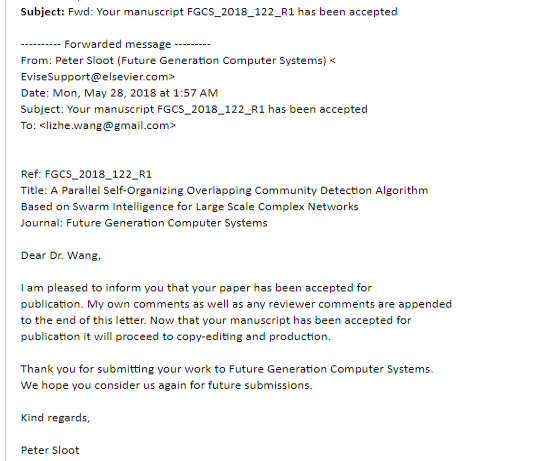 近日,由实验室成员孙韩林、马素刚、王忠民等撰写的论文“A Parallel Self-Organizing Overlapping Community Detection Algorithm Based on Swarm Intelligence for Large Scale Complex Networks”被国际期刊《Future Generation Computer Systems》(FGCS)录用。FGCS目前在中科院期刊分区中位于“工程技术-计算机:理论方法”的2区,其2016-2017年影响因子达3.997。
