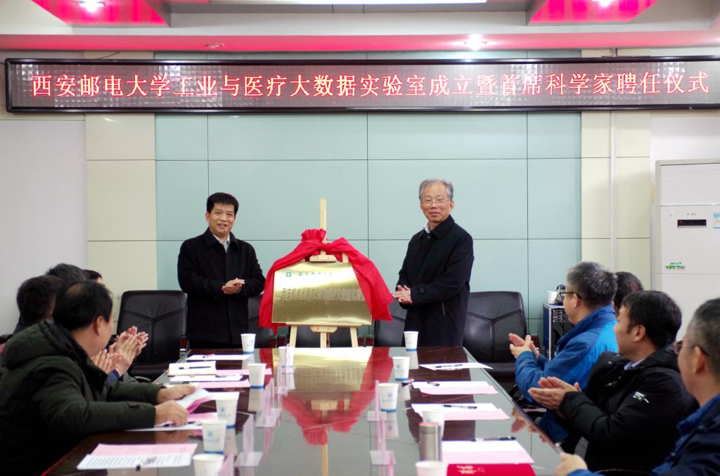 杨更社与刘韵洁共同为西安邮电大学工业与医疗大数据实验室揭牌。范九伦为刘韵洁院士颁发了首席科学家聘书。