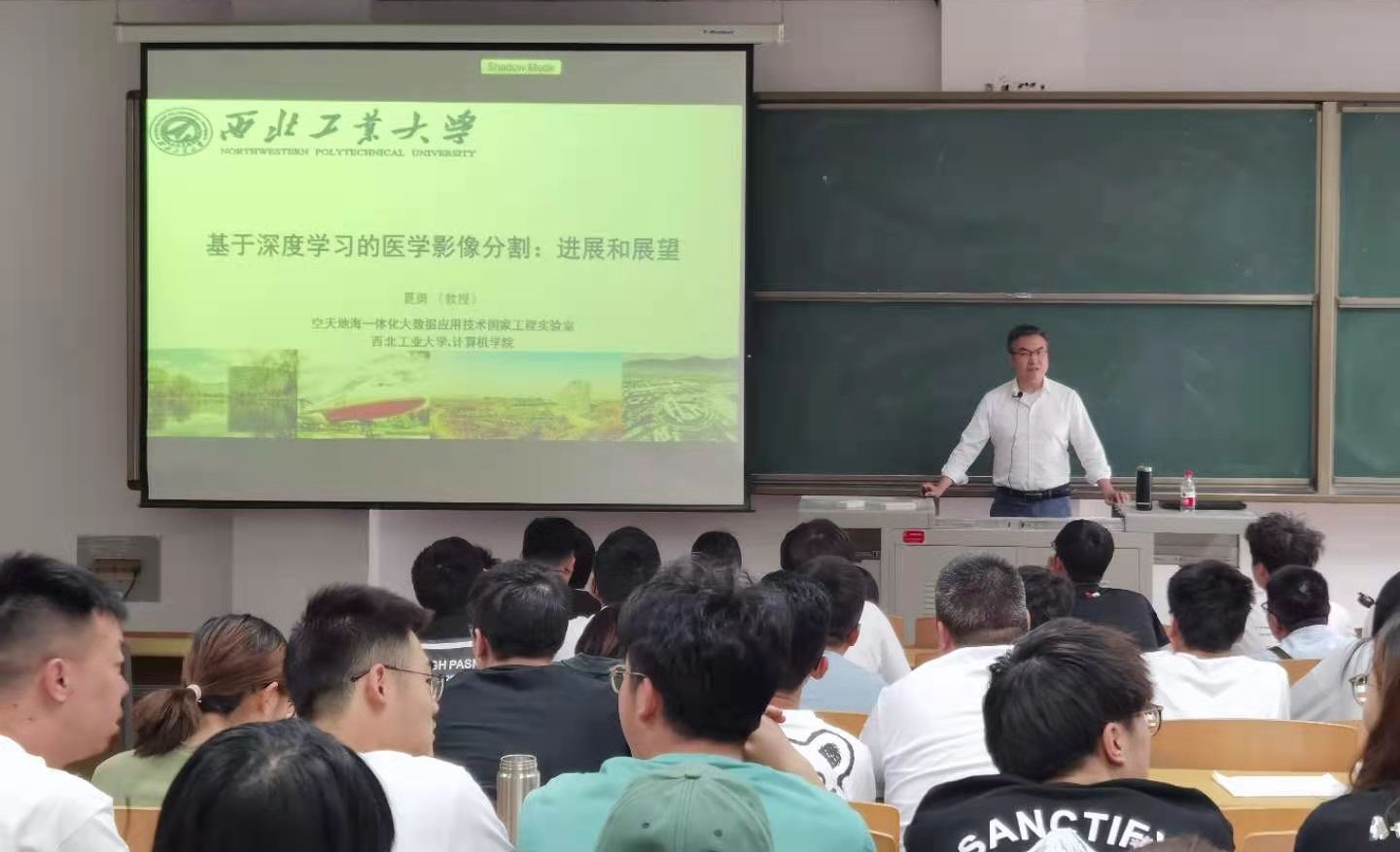 夏勇教授做了题为“基于深度学习的医学影像分割技术”的学术报告。在报告中,夏勇教授介绍了深度学习在各个领域取得的巨大成功,并以腹部器官和肿瘤、前列腺和胶质瘤分割为例,详细介绍了在应用深度学习技术进行医学图像分割方面的经验和体会,同时,与参会师生探讨了基于深度学习的医学影像分割研究所面临的机遇与挑战。会议现场学术氛围热烈,参会师生踊跃提问,夏勇教授与我院师生就深度学习及相关领域进行了深入的交流。